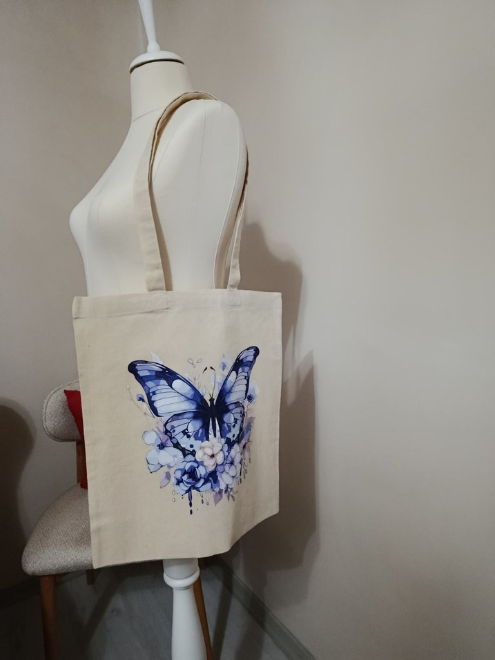 Bohem tarzda, hafif mavi kelebek baskılı sentetik kumaş kadın çanta. Uzun saplı, minimalist ve günlük kullanıma uygun.