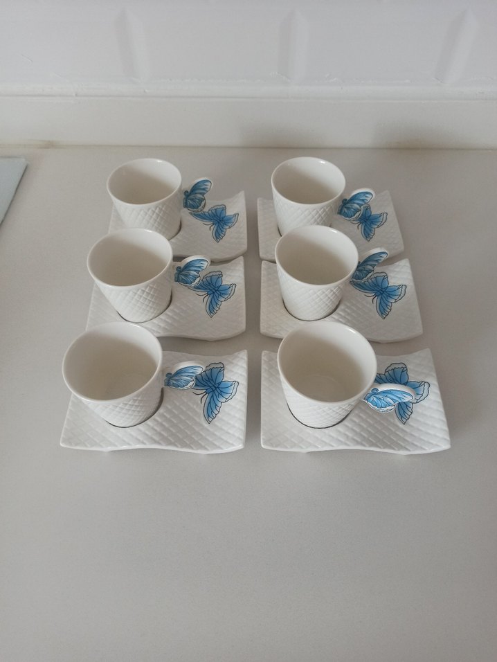 Mavi kelebek desenli, dokulu yüzeye sahip beyaz kahve fincanı ve tabak seti. Her biri şık ve kullanışlıdır. ☕12 kişilik fincan mevcut 6 adet fiyatıdır toplu alımda yardımcı olunur