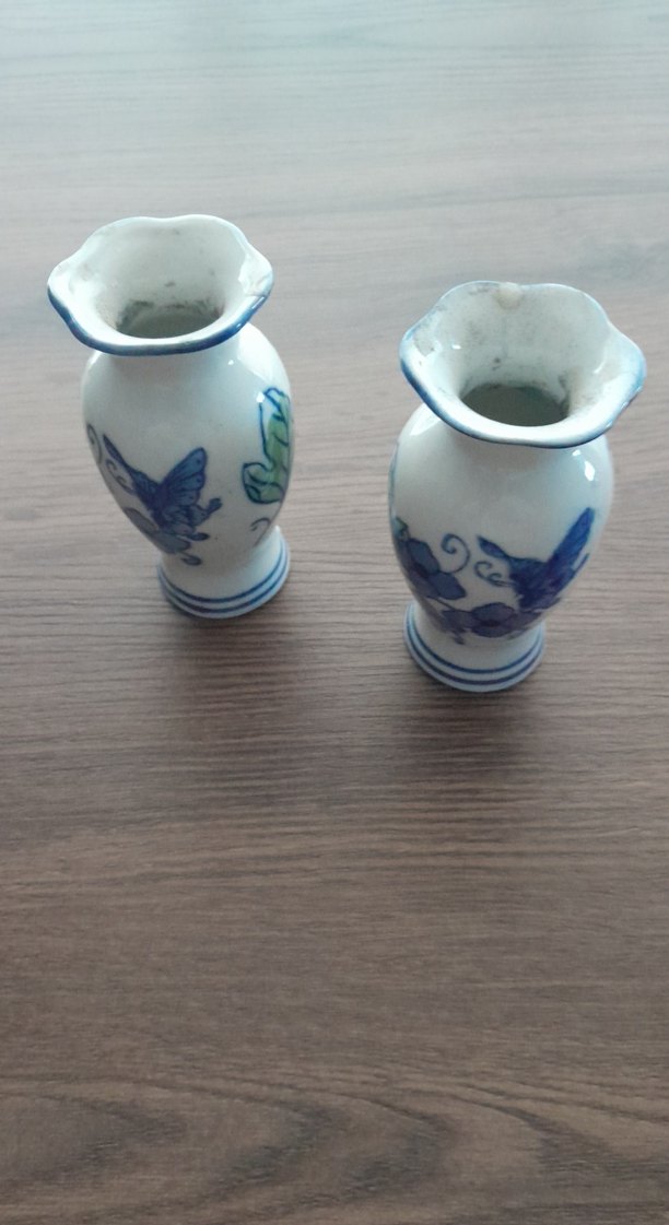 Mavi kelebek desenli, renkli detaylara sahip iki küçük seramik vazo seti. Klasik şekilli ve geniş ağızlıdır.