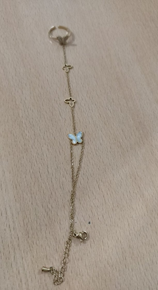 Pastel mavi kelebek detaylı ince zincirden oluşan kadın çelik şahmeran minimalist bohem tarzıyla uyumlu. Nakış desenli ve günlük kullanım için uygun.