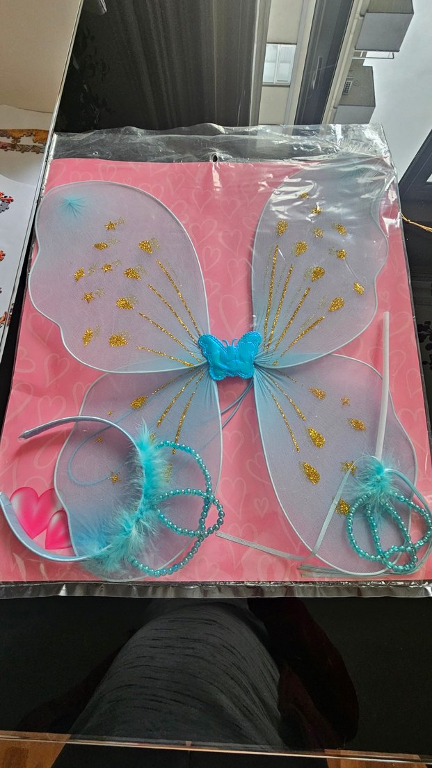 Işıltılı detaylara ve fiyonk süslemeye sahip açık mavi kelebek kanatlı bohem tarz kız aksesuar seti. Kanatlar, taç ve tüy detaylı bileklikler içerir.