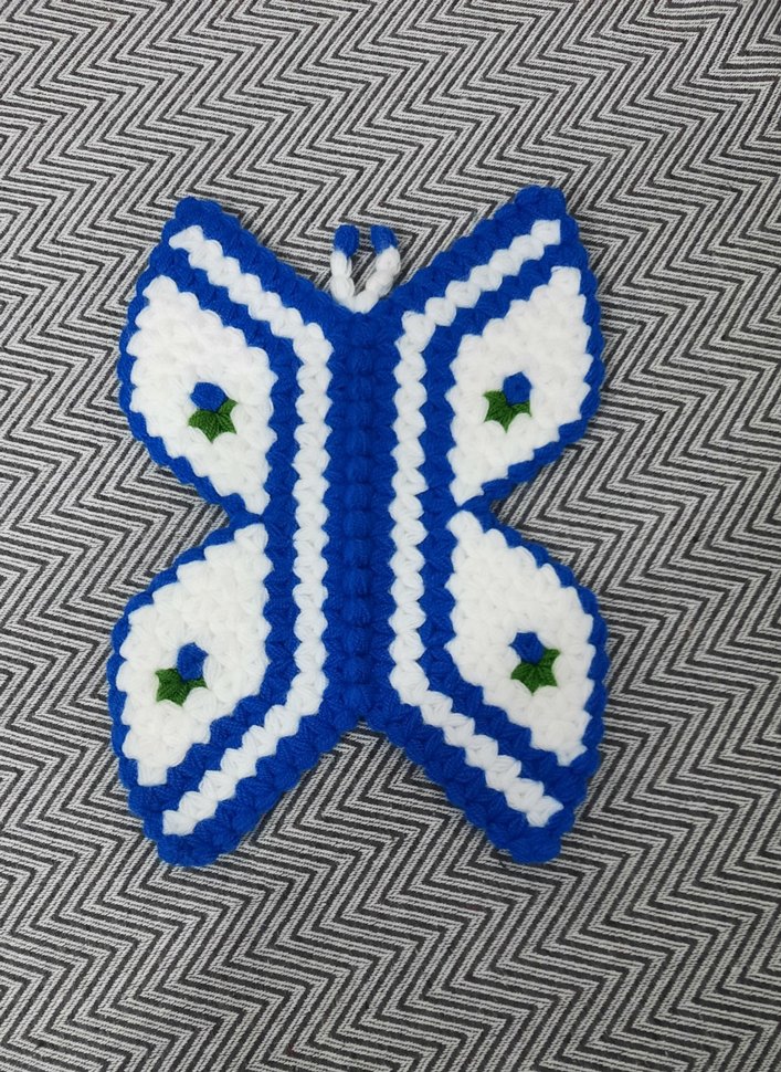 Mavi ve beyaz renklerde, kelebek şeklinde yumuşak banyo süngeri, renkli detaylara sahip.