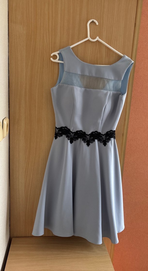 Kolsuz, kemer detaylı mavi midi abiye elbise. Modern klasik tarzda, düğünler için uygun, vücuda oturan kesim. 34 Beden