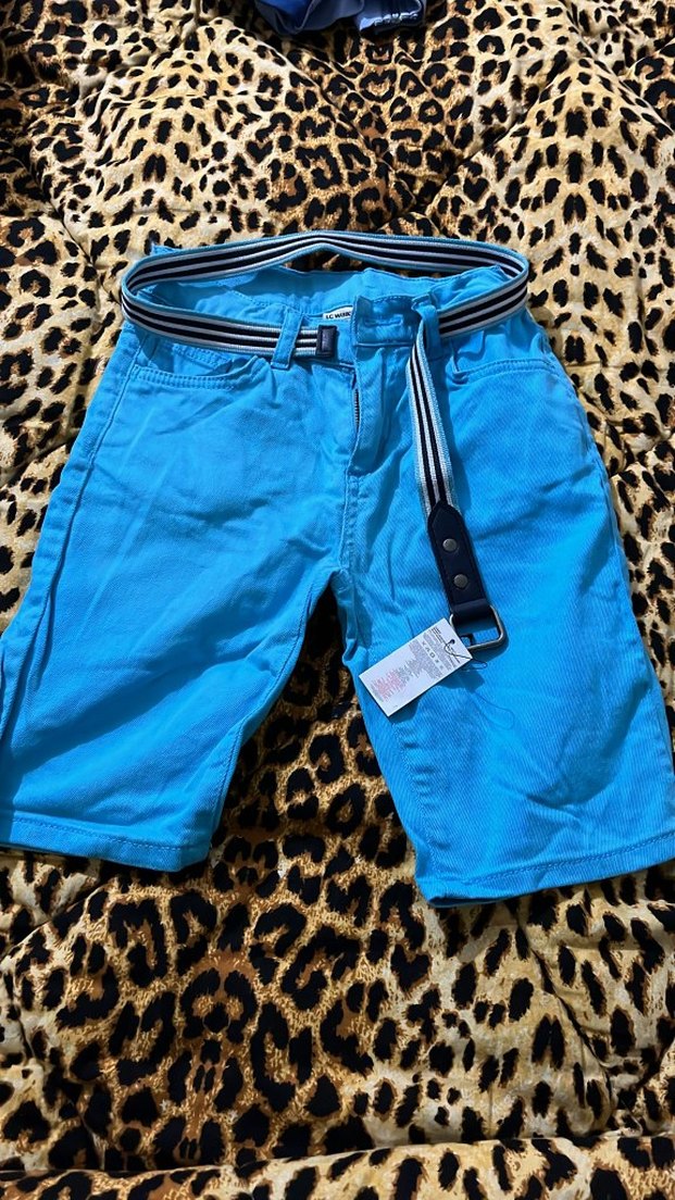 Kemerli, mavi renkli, erkekler için fitted kesim denim şort. Renkli ve rahat sokak stili için uygundur.