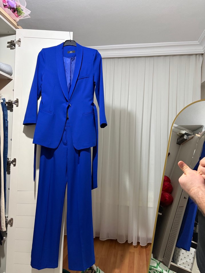 Mavi renkli, kemerli ve kesimli yakalı kadın blazer. Normal boy ve rahat kesim, ipeksi kumaş ve askılı kollara sahiptir. Ofis için uygun.
