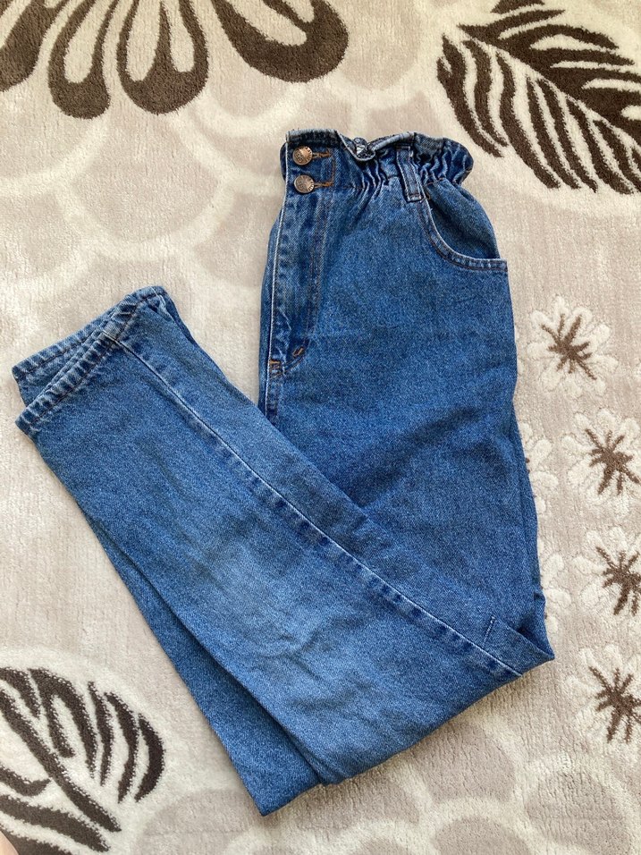 Mavi denim kumaştan, kemerli ve bol kesim kadın pantolonu. Günlük kullanıma uygun, midi boyda ve desensiz tasarım.