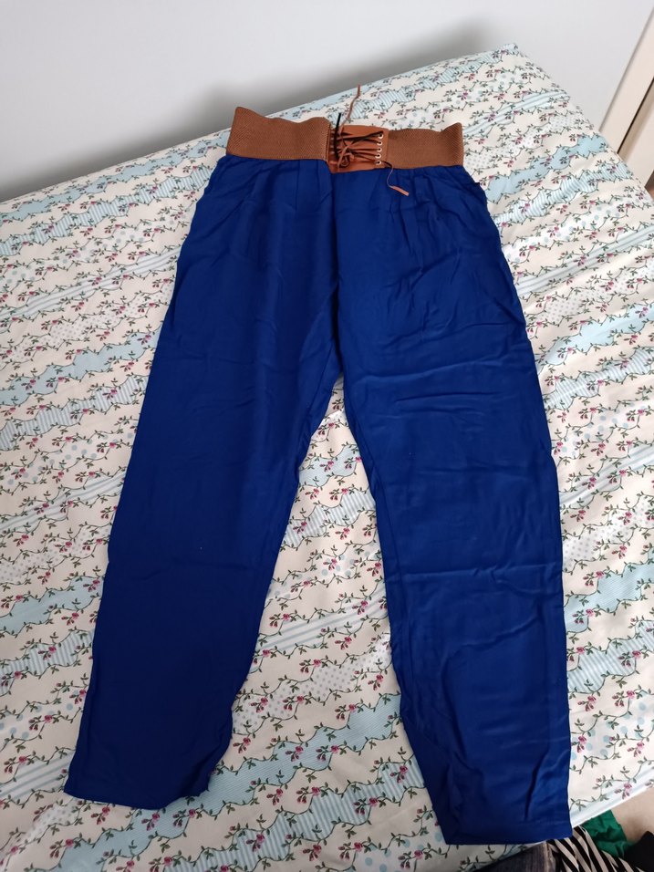 Mavi renkli, pamuk kumaştan, belinde kahverengi kemer detaylı, midi boy, bol kesim kadın pantolon. Günlük rahat kullanım için uygundur.