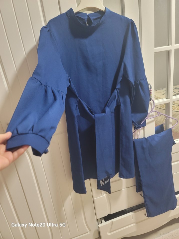 Mavi renkli, uzun kollu ve yuvarlak yakalı mini tunik, kemerli ve regular fit kesimlidir. Sentetik kumaştan yapılmış, günlük kullanım ve streetwear tarzına uygundur. ikili takım sıfır olarak aldım ama bana büyük geldi 44.46 birine olur