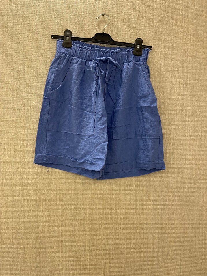 Mavi keten kumaştan, kemerli ve bol kesim mini şort. Günlük rahat kullanıma uygun, parlak görünümlü.