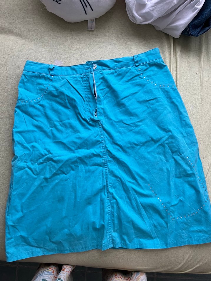 Mavi renkli, kemerli ve bol kesim midi kadın etek, rahat keten kumaştan üretilmiştir, gündelik dış mekan kullanımı için uygundur.