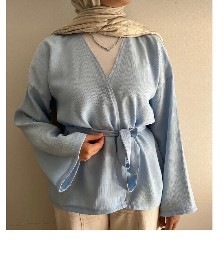 Yumuşak keten kumaştan, bol kesim, V yaka ve uzun kollu mavi kimono. Kemerli, şık ve rahat sokak stili için uygun. Günlük kullanıma ideal.