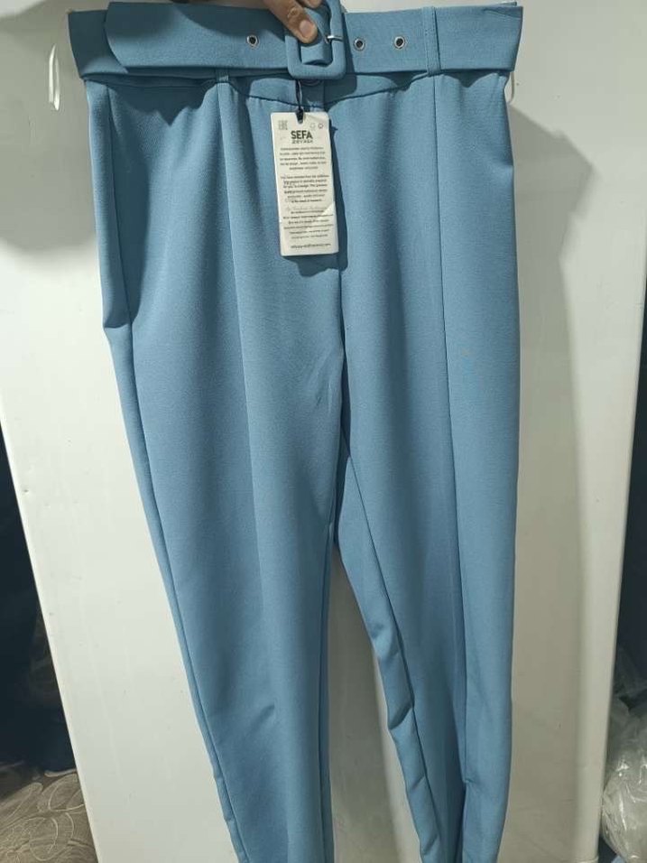 Mavi renkte, kemerli ve midi boyda, yumuşak sentetik kumaştan yapılmış kadın pantolonu. Rahat kesimiyle günlük ve ofis kullanımı için uygundur.