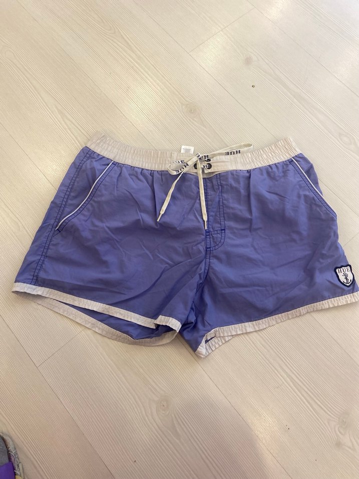 Pastel mavi renkte, kemerli ve bol kesim erkek deniz şortu, plaj için uygun sade tasarım.İngiltereden orjinal ürün