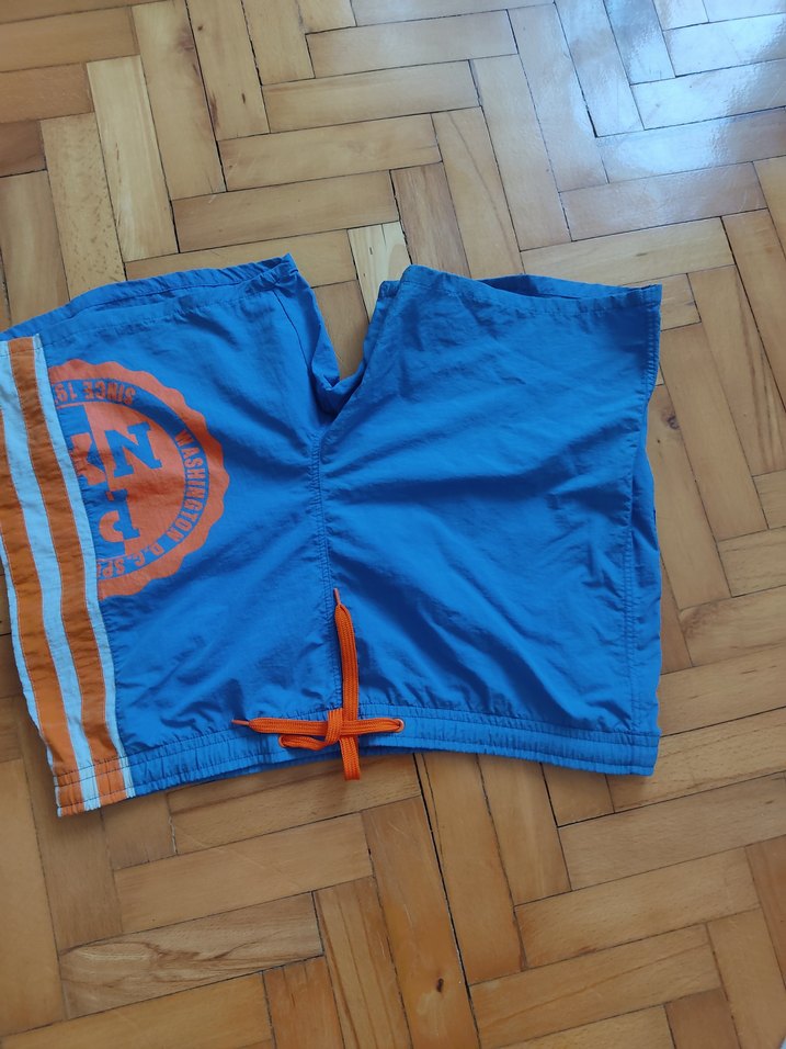 Parlak mavi renkte, kemerli ve bol kesim erkek mini mayo, sade tasarımıyla plaj için uygundur.