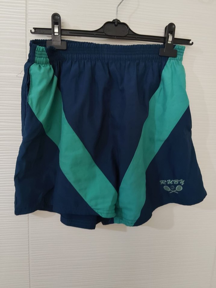 Koyu mavi renkli, kemerli ve bol kesim erkek mini spor şortu. Teal renkli şerit detayları ve 'RuBY' markası bulunur. denız sortu