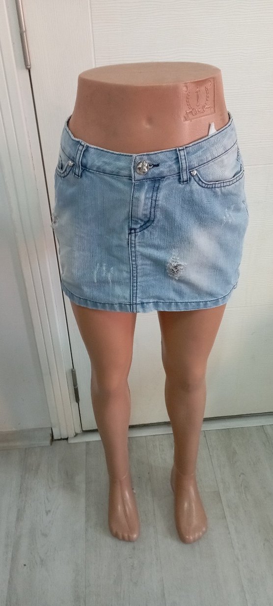Pastel mavi renkte, kemerli ve kısa kesim, dar kesim mini kot etek. Hafif yıpranmış detaylarıyla günlük sokak modasına uygun.