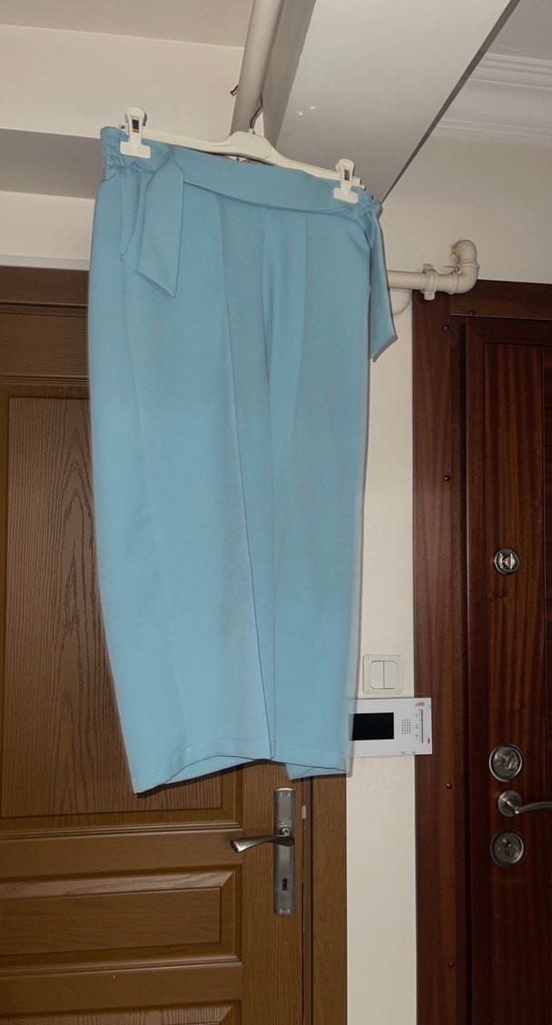 Pastel mavi renkte, kısa boy ve regular fit kumaş pantolon. Kemer detayına sahip, iş ve günlük sokak stiline uygun.