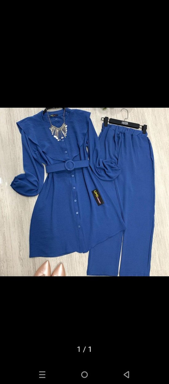 Mavi renkli, kemerli ve uzun kesim kadın takımıdır. Uzun kollu, kayık yaka ve düz desensizdir. Günlük ve iş kombini için uygundur.