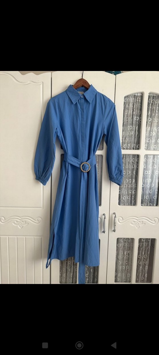 Mavi keten kumaştan, uzun kollu ve kesik yaka detaylı, kemerli ve regular fit uzun elbise. Minimalist, desensiz tasarımıyla ofis ve sokak stiline uygundur.