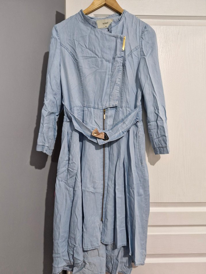 Pastel mavi renkli, kemerli ve bol kesim uzun kot cekettir. Notlu yaka ve askılı kollara sahiptir, bohem ve Paris tarzını yansıtır.
