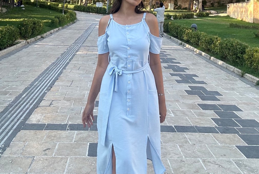 Pastel mavi kot kumaştan, straplez yaka ve askılı, omuzları açık, kemerli uzun elbise. Düğmeli ön ve yanlarda yırtmaçlı, rahat kesim sokak stili elbise.