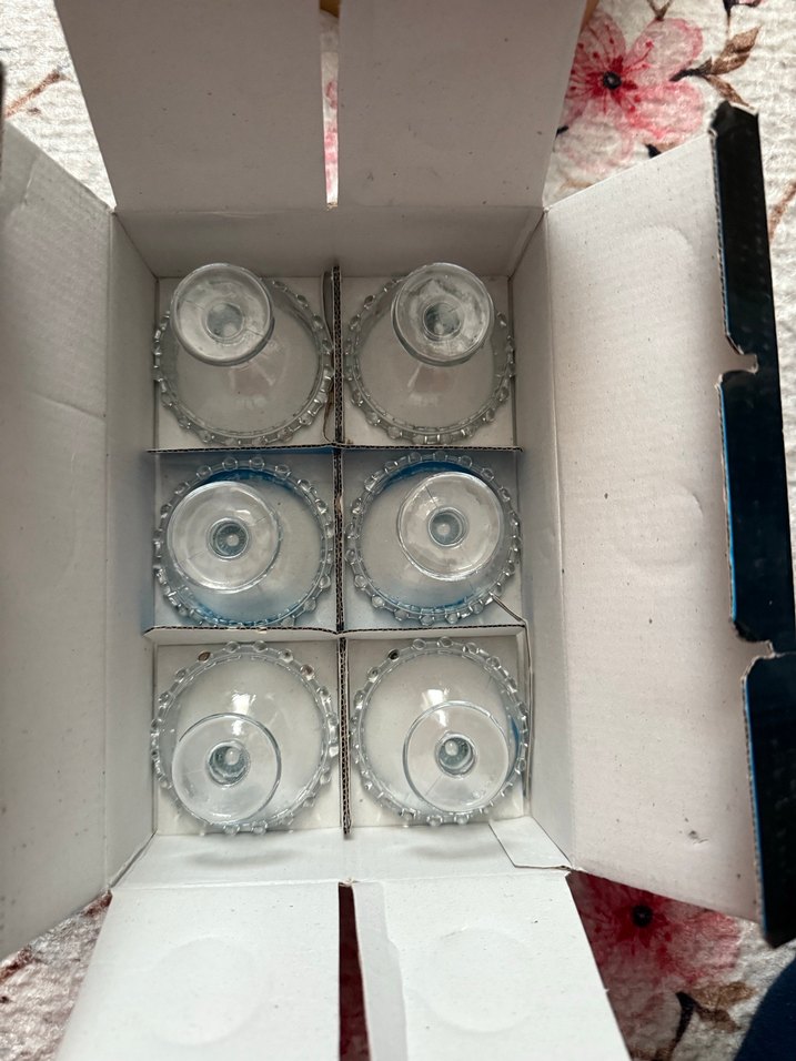 Altı adet, mavi kenarlı şeffaf cam bardak içeren set, kutusunda düzenli şekilde paketlenmiştir.