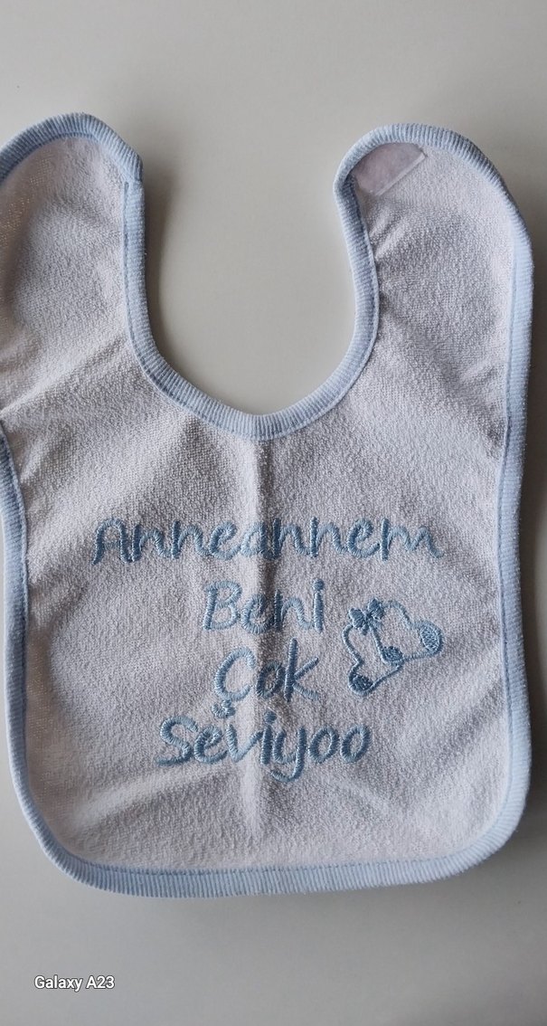 Mavi kenarlı, baskılı mesaj ve küçük ayıcık figürü bulunan gri bebek önlüğü. Yumuşak ve emici kumaş, yemek sırasında bebeği temiz tutar. cok iyi durumda. az kullandım.. arkası su sızdırmaz.