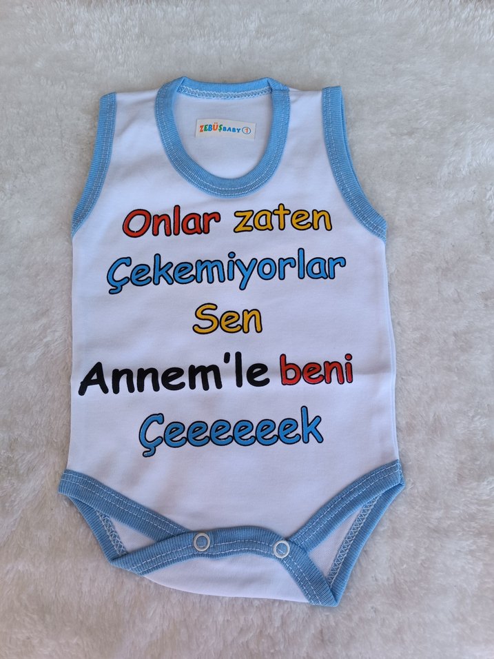 Mavi kenarlı, pamuklu, kolsuz atlet tarzı bebek body. Renkli baskılı yazı ve çıtçıtlı alt kısmı vardır. 3 aylık 6-9-12 ve 18 aylık mevcut