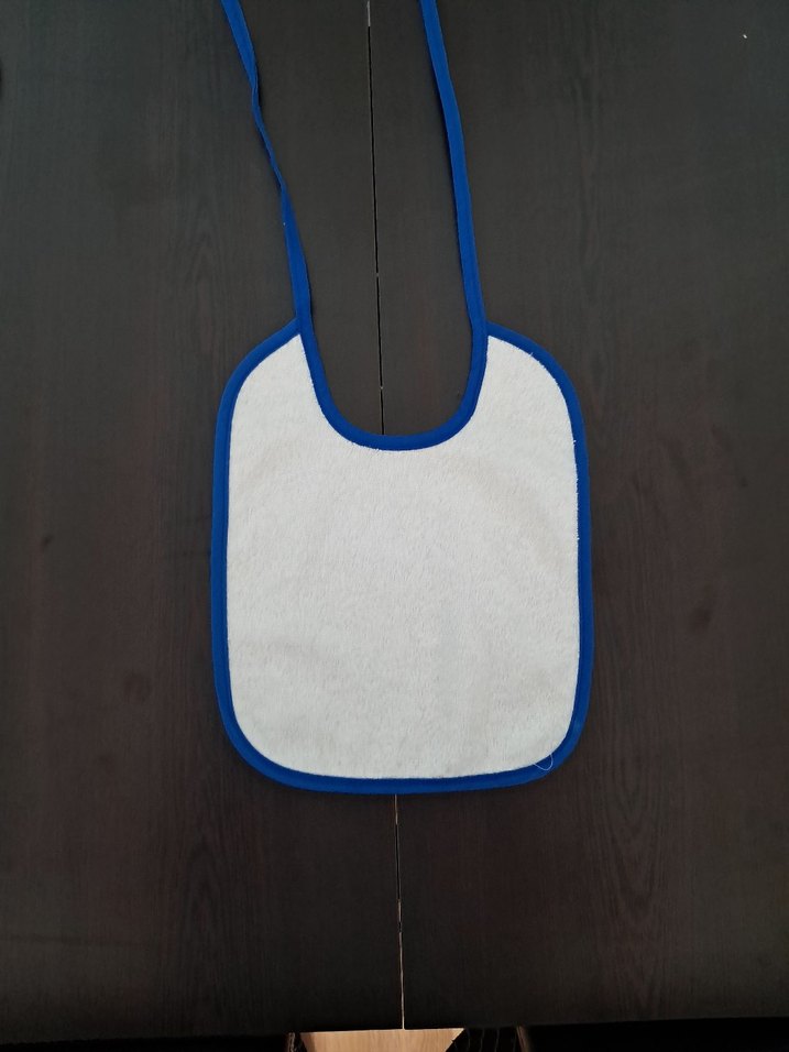 Mavi kenarlıklı, desensiz bebek önlüğü, yumuşak kumaştan üretilmiş rahat kullanımlık bir üründür.