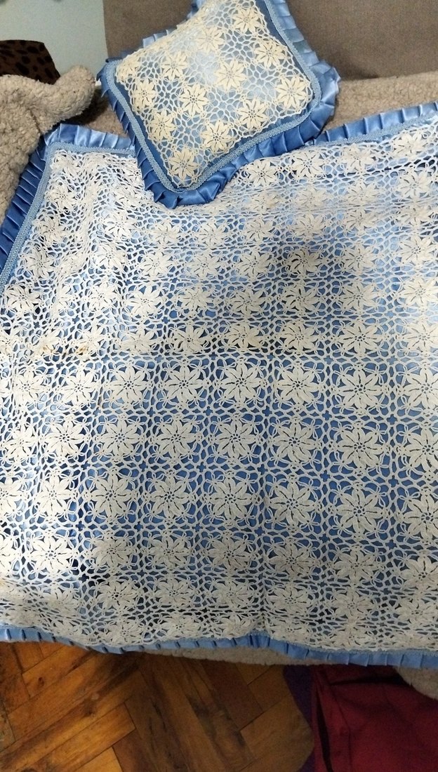 Mavi Kenarlı Beyaz Dantel Örtü. bebek battaniyesi.