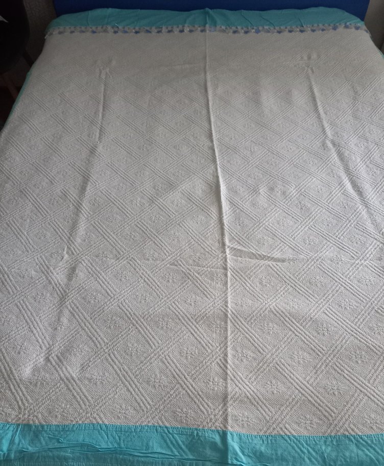 Beyaz yatak örtüsü, ince dokulu deseni ve mavi kenarlarıyla sade ve şık bir görünüm sunar. ️Severek kullanildi. yikanip mis gibi utulendi