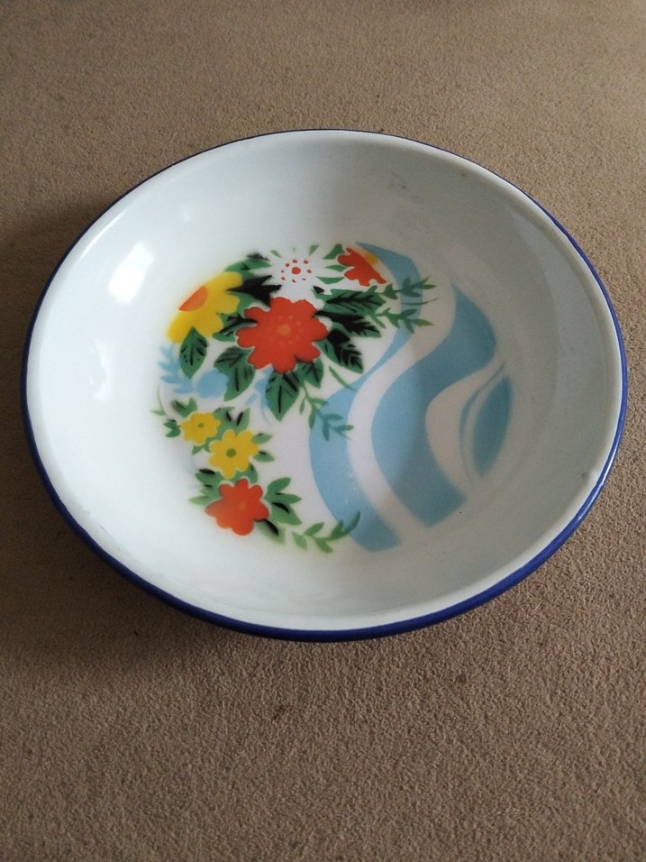Mavi kenarlı, beyaz taban üzerine renkli çiçek desenli geleneksel tarzda tabak. ️