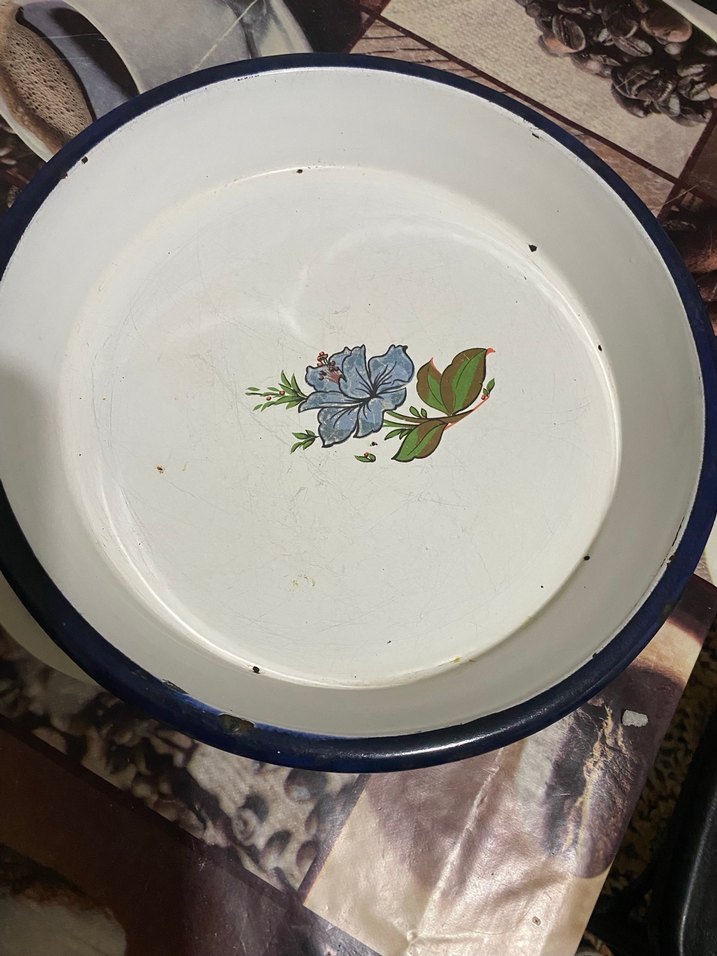 Koyu mavi kenarlı, ortasında çiçek deseni bulunan klasik beyaz tabak. ️