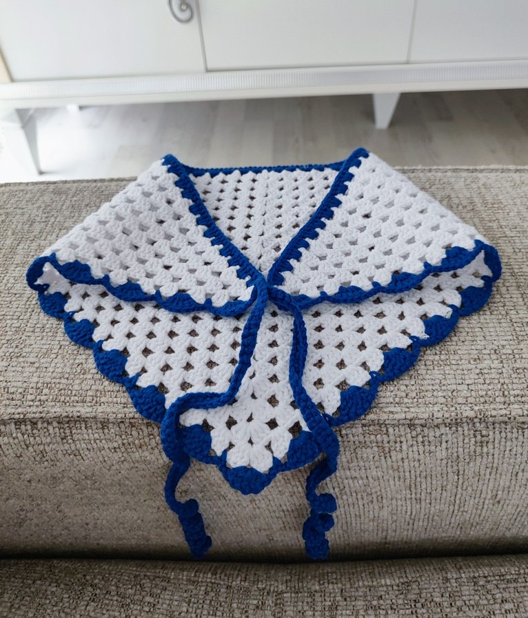 Kendi el emeğimdir.Başkası tarafından kullanılamaz.Mavi kenar detaylı, beyaz örgü kadın şalı. Rahat ve sade tasarımıyla günlük kullanıma uygundur.