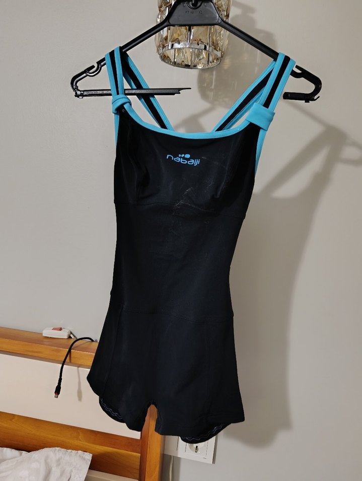 Siyah mayo, koyu mavi askılar ve cırt cırt detayıyla, cesur athleisure tarzında plaj için uygun.