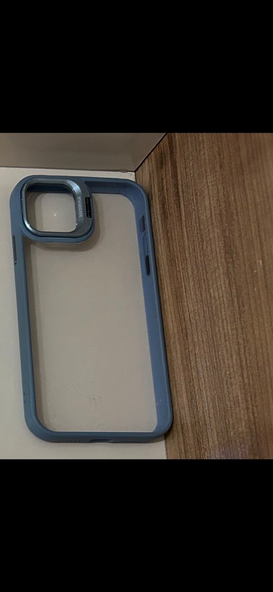 Mavi kenarlıklı, gri şeffaf arka yüzeye ve tokalı detaya sahip sade ve güvenli telefon kılıfı. Masa gbi yerlere koyma özelligi var Temizdir iphone 11 icin uygun