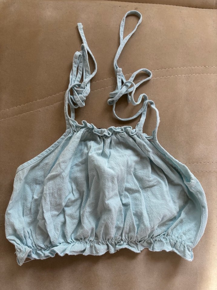 Mavi keten kumaştan, straplez ve askılı, volan detaylı, bol kesim bohem tarzda crop top. Normal midi boyda.