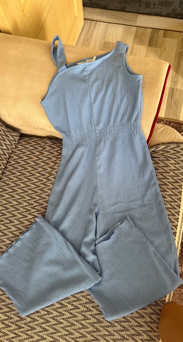 Mavi keten kumaştan yapılmış, Yamuk desen yaka ve drapeli tasarıma sahip, regular fit uzun tulum. Rahat ve bohem tarzda