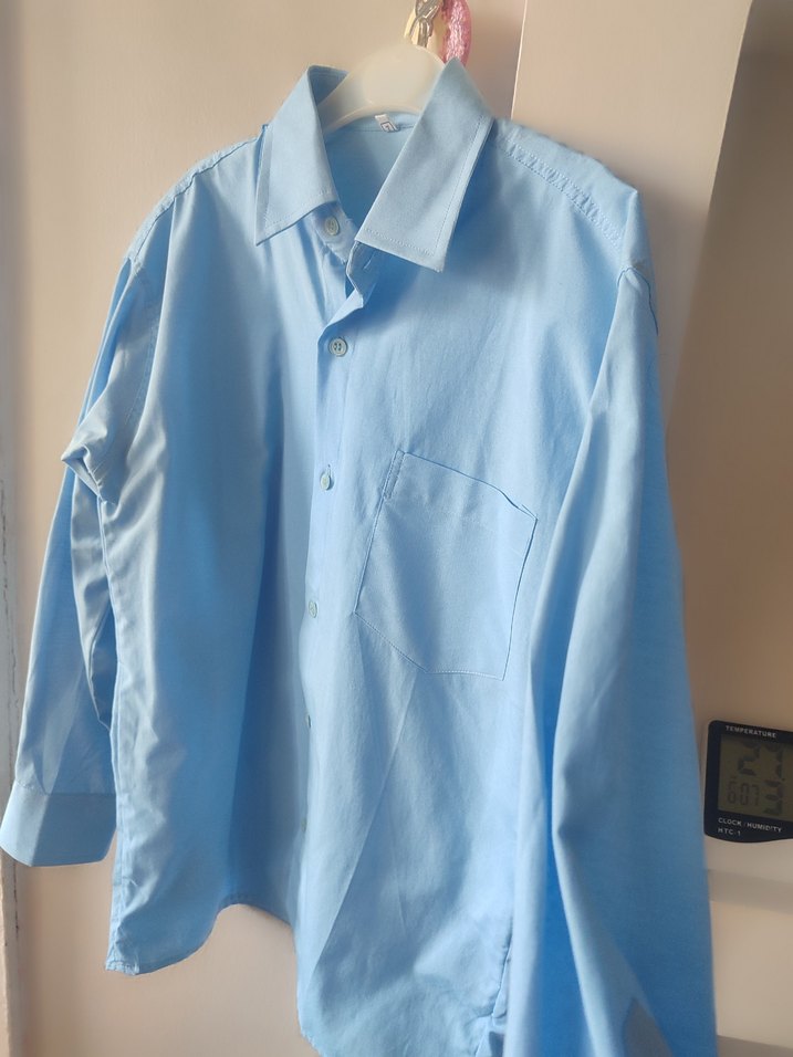Mavi keten erkek gömlek, düğmeli ve uzun kolludur. Gevşek kesimi ve pastel tonu ile ofis için uygundur. okul rengine uygun sıfır ürün