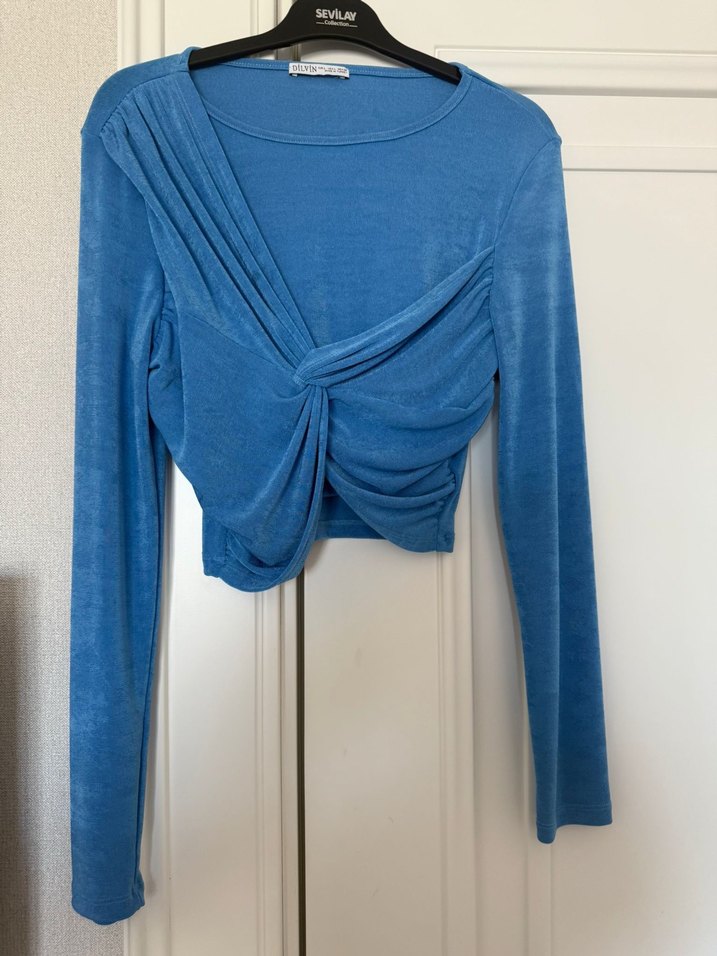 Mavi keten kumaştan, uzun kollu, drapeli ve fitted kesime sahip bluz. Yuvarlak yakalı ve midi uzunluğunda, günlük rahat stil için uygun.