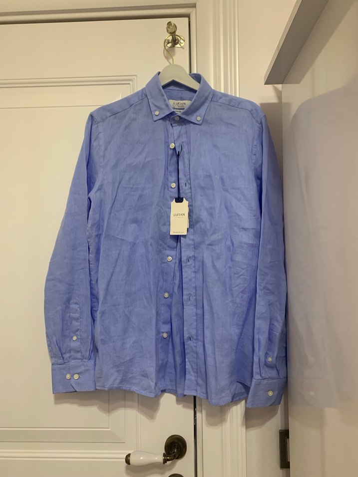 Mavi keten erkek gömlek, düğmeli ve yakalıdır. Uzun kollu, regular fit kesimi ile ofis ve günlük sokak stiline uygundur.
