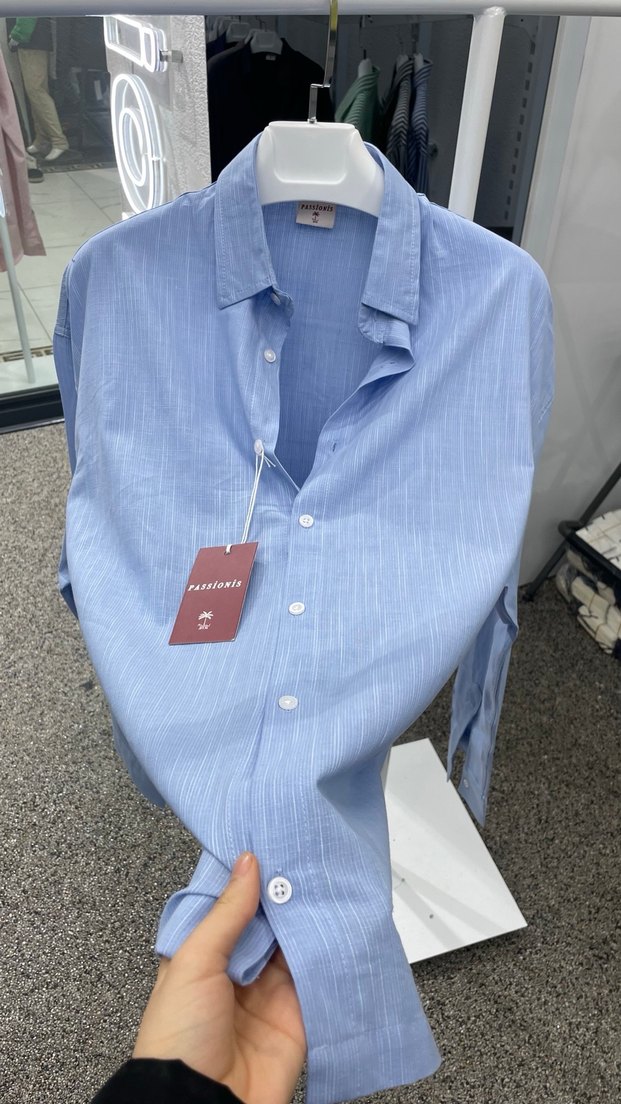 Mavi keten kumaştan, düğmeli ve uzun kollu erkek gömleği. Regular fit ve midi boyda, gündelik sokak stili için uygundur.
