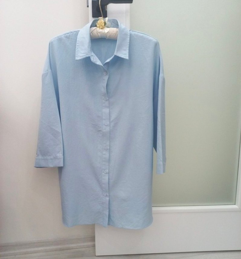 Mavi keten kumaştan yapılmış, düğmeli ve kısa kollu kadın gömleği. Normal kesim ve minimalist tarzda, günlük kullanıma uygundur.