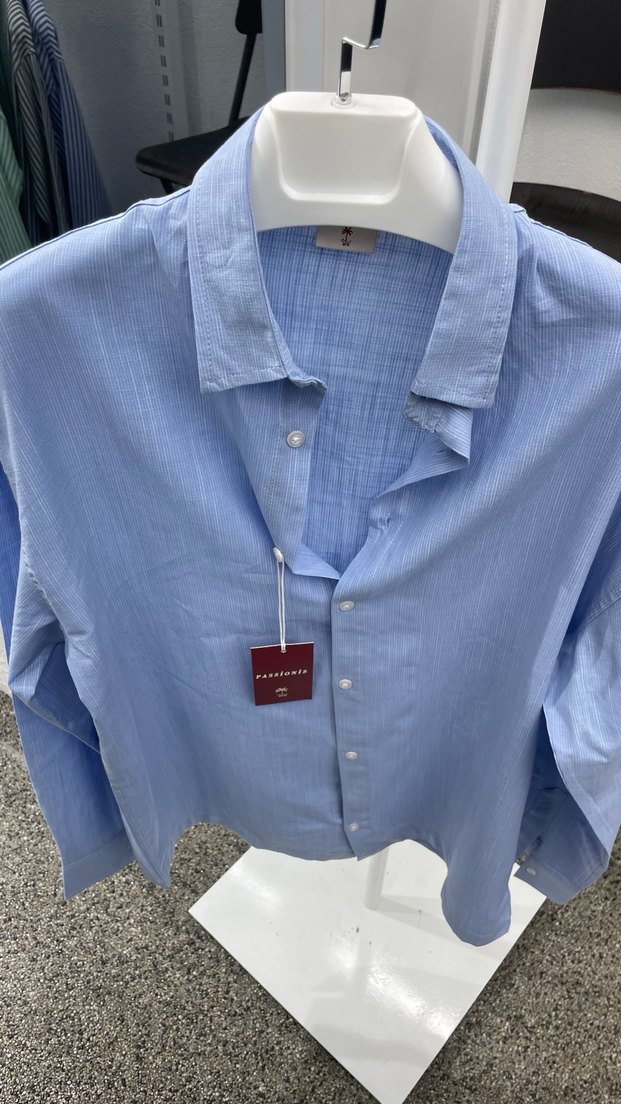Pastel mavi keten kumaştan, düğmeli ve yakalı uzun kollu gömlek. Normal boy ve regular kesim, ofis ve günlük kullanıma uygun.