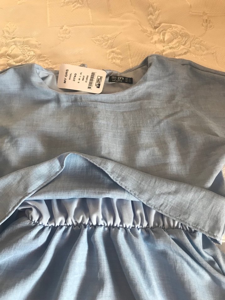 Mavi renkte, yumuşak keten kumaştan yapılmış, salaş kesim Tekne yaka, kısa kollu ve göğüs altı fırfırlı detay içerir. Günlük kullanım için uygundur.