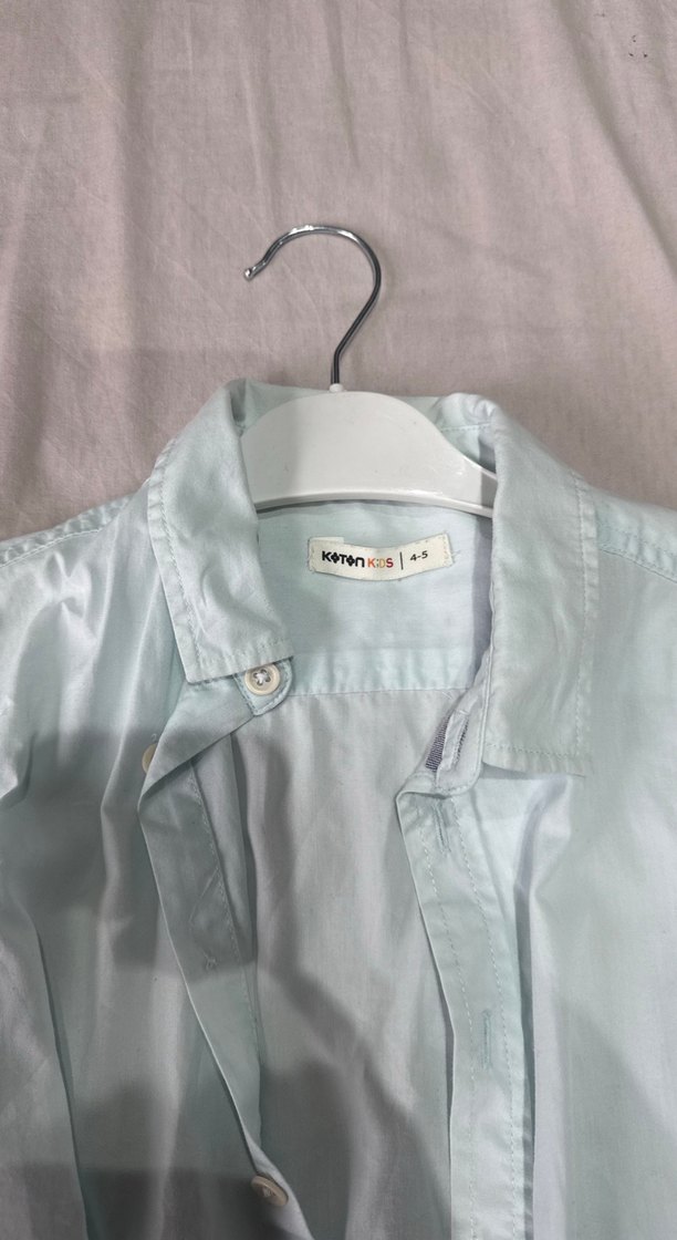 Mavi pastel renkte, keten kumaştan yapılmış, düğmeli ve yakalı, kısa kollu erkek çocuk gömleği. Rahat kesimiyle sokak stili için uygundur.