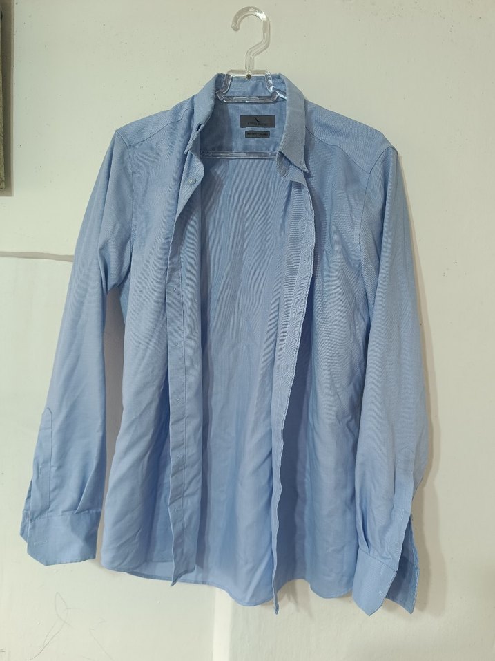Pastel mavi renkli, uzun kollu, yakalı ve düğmeli ön kısmı olan keten erkek gömleği. Ofis ve günlük sokak stili için uygun, rahat kesim ve normal boyda.