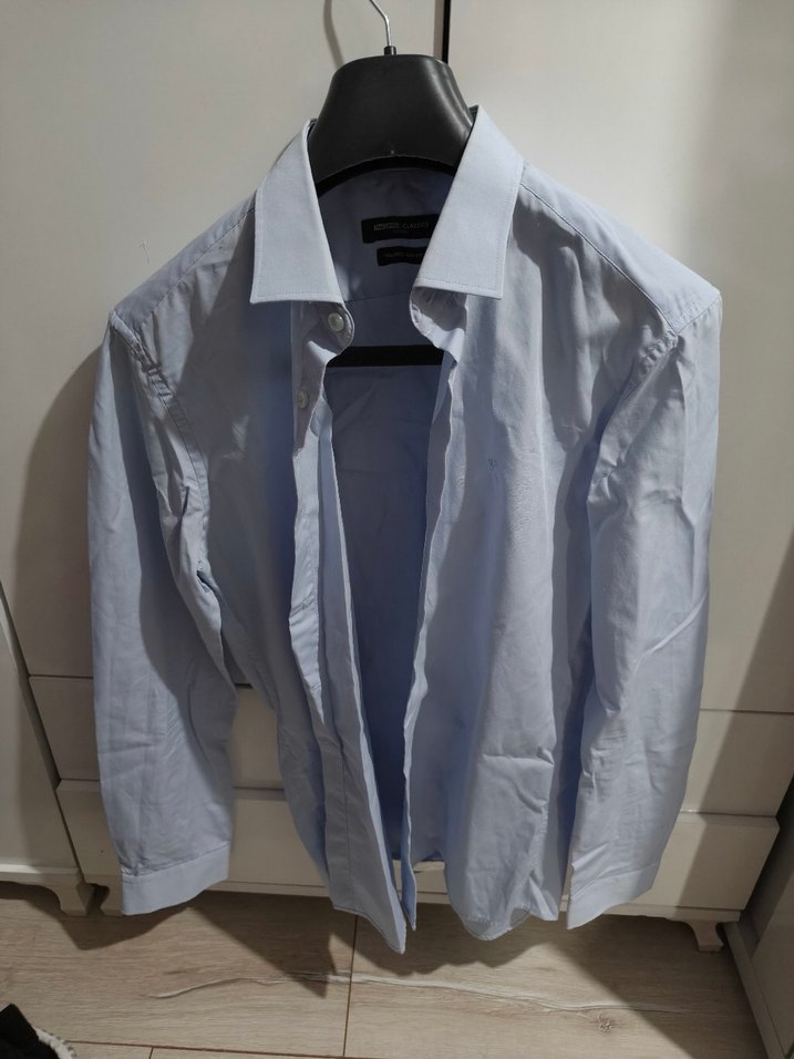 Mavi renkte, keten kumaştan üretilmiş, klasik yakalı ve düğmeli erkek gömlek. Uzun kollu, normal boyda ve rahat kesimlidir. İş ve günlük kullanım için uygundur.