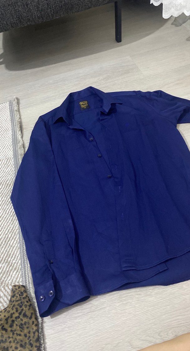 Parlak mavi keten erkek gömlek, yakalı ve uzun kollu, bol kesim. Düğmeli ön kısmı ve normal boyu ile günlük rahat kullanım için uygundur.