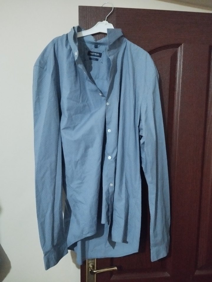 Mavi keten kumaştan, yakalı ve düğmeli erkek gömleği. Uzun kollu ve normal kesimdir, günlük rahat kullanım için uygundur.